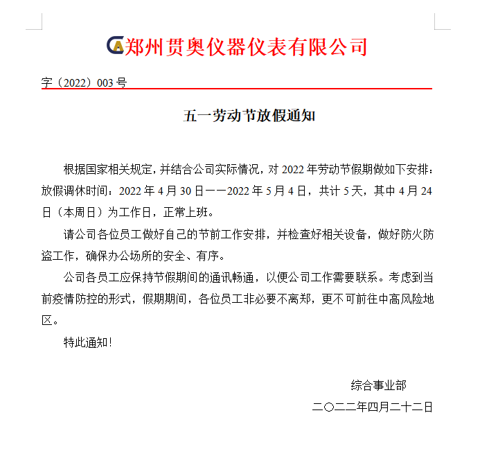 鄭州貫奧儀器儀表有限公司2022年五一勞動節(jié)放假通知