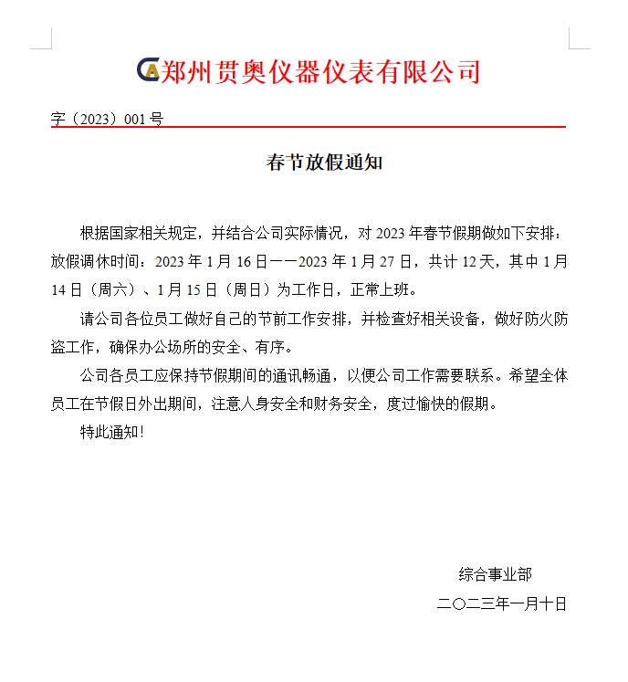 為了讓公司員工過個(gè)歡樂祥和的春節(jié),現(xiàn)將公司春節(jié)放假時(shí)間通知如下: