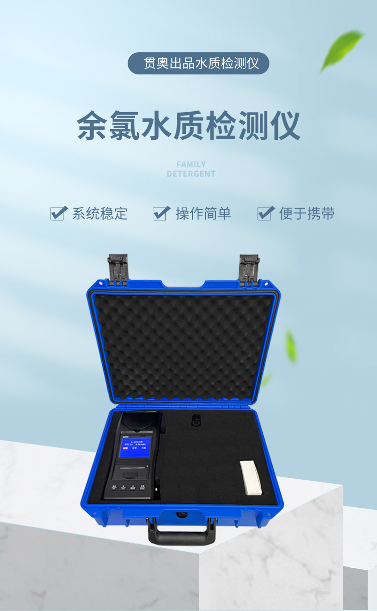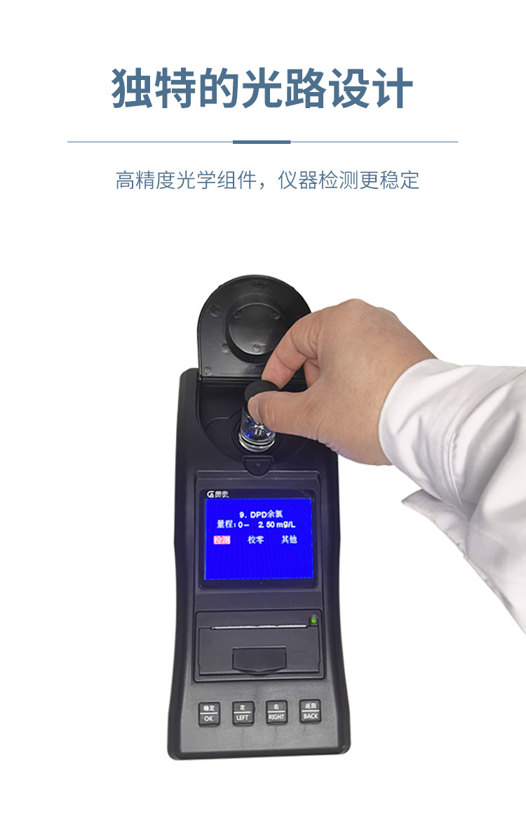 被檢測(cè)水質(zhì)樣品放入DPD游離余氯試劑時(shí),水樣會(huì)變成紅色,將水樣放入儀器后,余氯水質(zhì)檢測(cè)儀會(huì)通過(guò)光電比色檢測(cè)原理比較紅色的深淺,從而得出被檢測(cè)水質(zhì)的余氯濃度大小。
