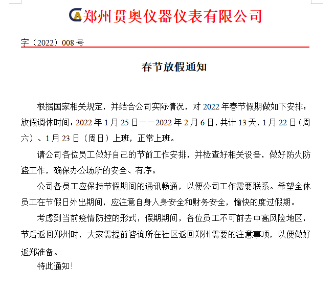 在此,感謝大家在過去一年里對(duì)鄭州貫奧儀器儀表的支持與信任。同時(shí)也希望在新的一年里,鄭州貫奧儀器儀表能繼續(xù)得到大家的關(guān)注及支持,并且鄭州貫奧儀器儀表也會(huì)一如既往地為大家提供更優(yōu)質(zhì)的服務(wù)!