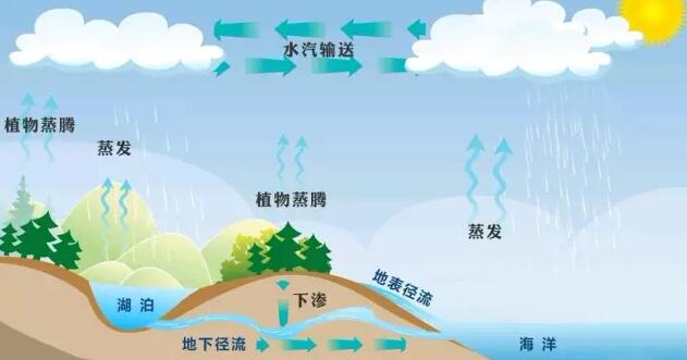 水體是水匯集的場所,按水體所處的位置,可粗略地將其分為地表水、地下水和海洋等三類。它們之間是可以相互轉化的。在太陽能、地球表面熱能的作用下,通過水的三態(tài)變化,水在不同水體之間不斷地循環(huán)著。