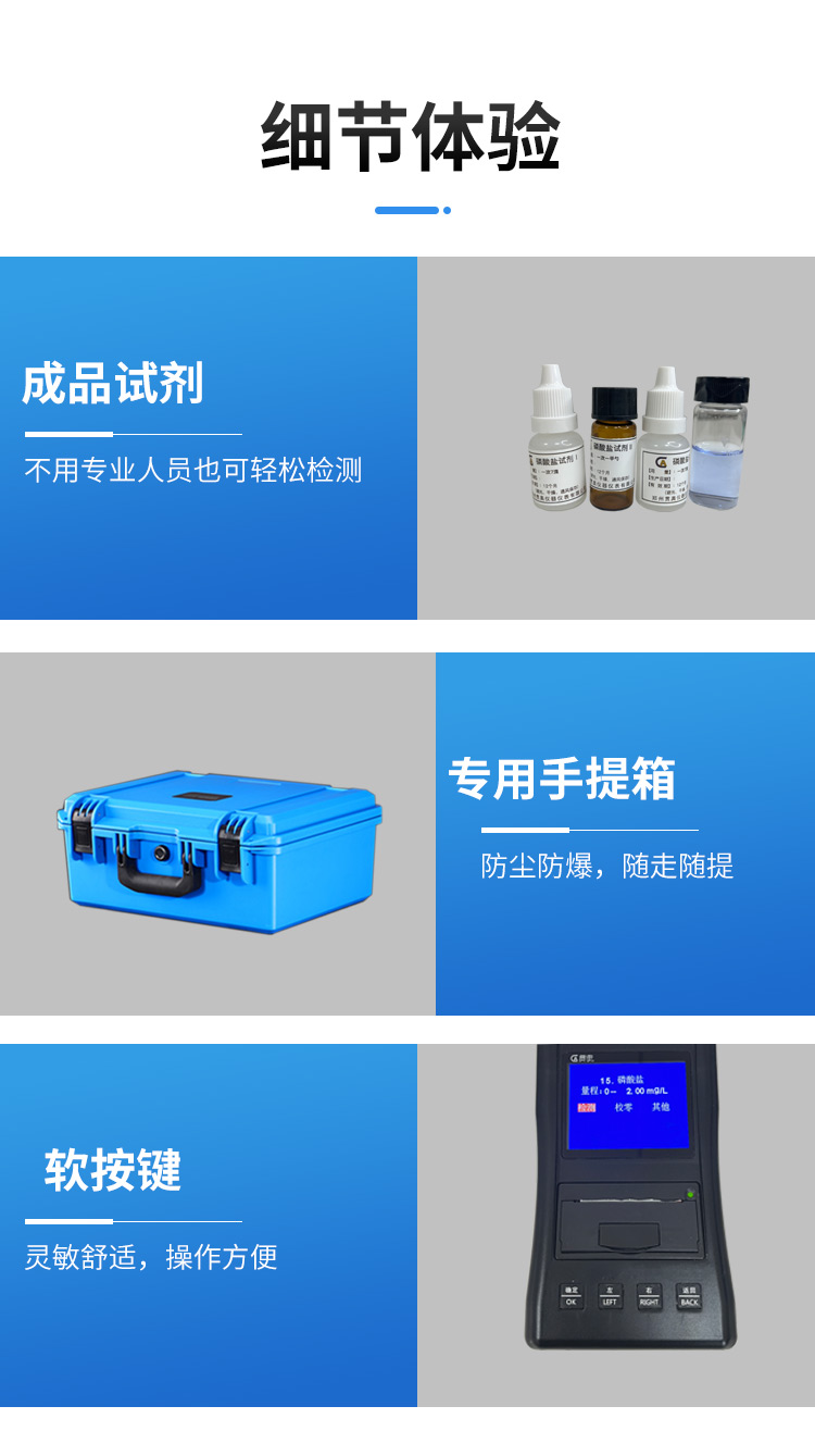 將水質(zhì)樣品倒入比色皿中,直至頂部的標記出,用超細纖維布擦拭比色皿,以去除油脂或指印,將試管放入水質(zhì)檢測儀中,然后進行校準,添加水質(zhì)檢測儀隨附的試劑進行測定。這種方法的優(yōu)勢在于精準度高、抗干擾能力強。